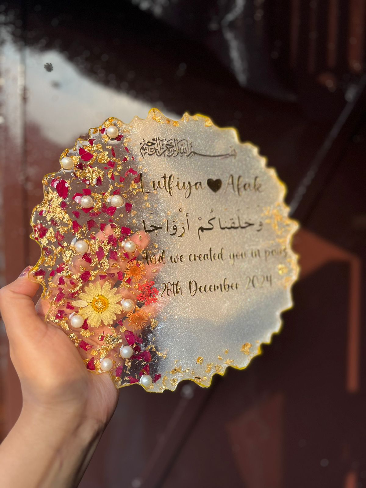 Our Engagement Resin Frame is a handcrafted keepsake designed to capture and protect memories from your engagement ceremony. Using real flowers, decorative elements, and custom details, we create a beautiful display frame sealed in crystal-clear resin so your special day never fades with time.